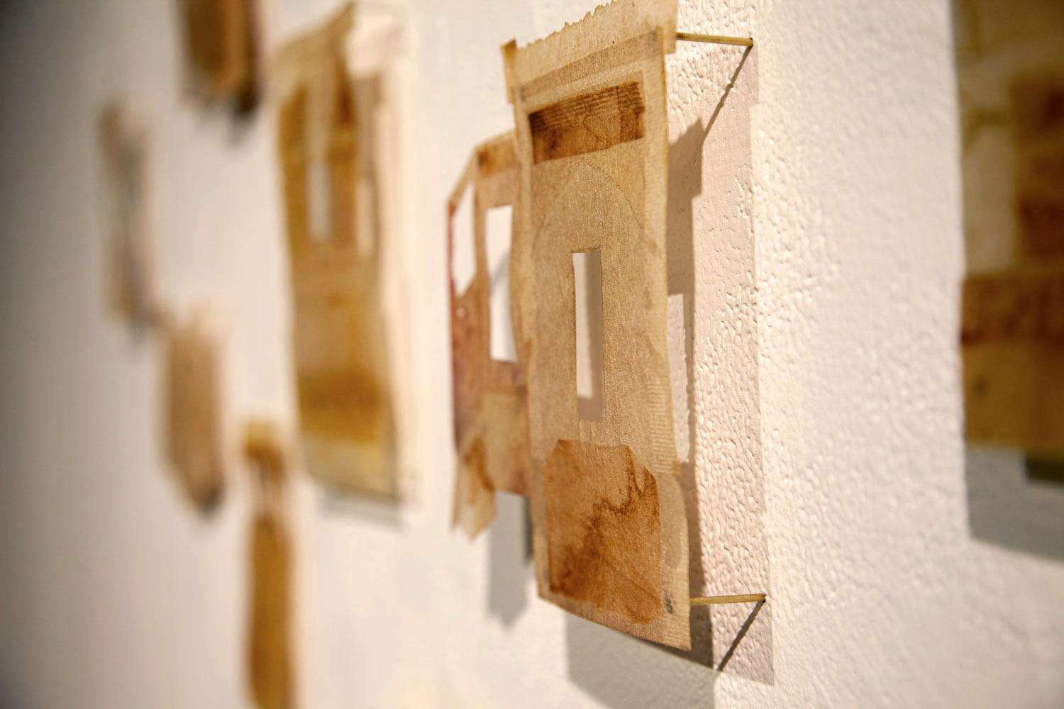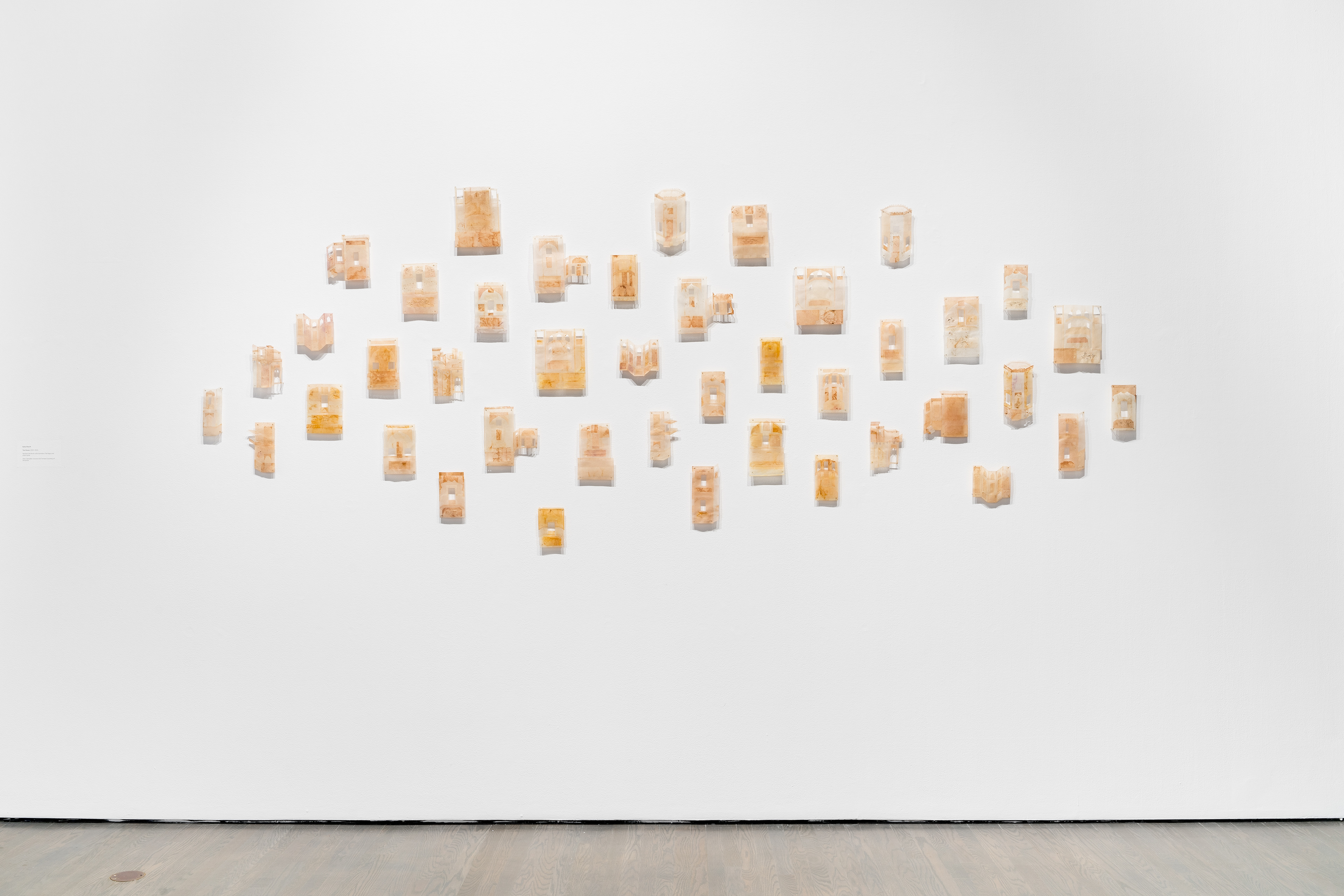 Installation view of Tea House and the Ignition exhibition, 2024-2025, Various dimension (each around 8x4 inches), Tea bags and starch glue, Taken by Jean-Michael Seminaro, Courtesy of the Leonard & Bina Ellen Art Gallery, Concordia University, Montreal, 2025.